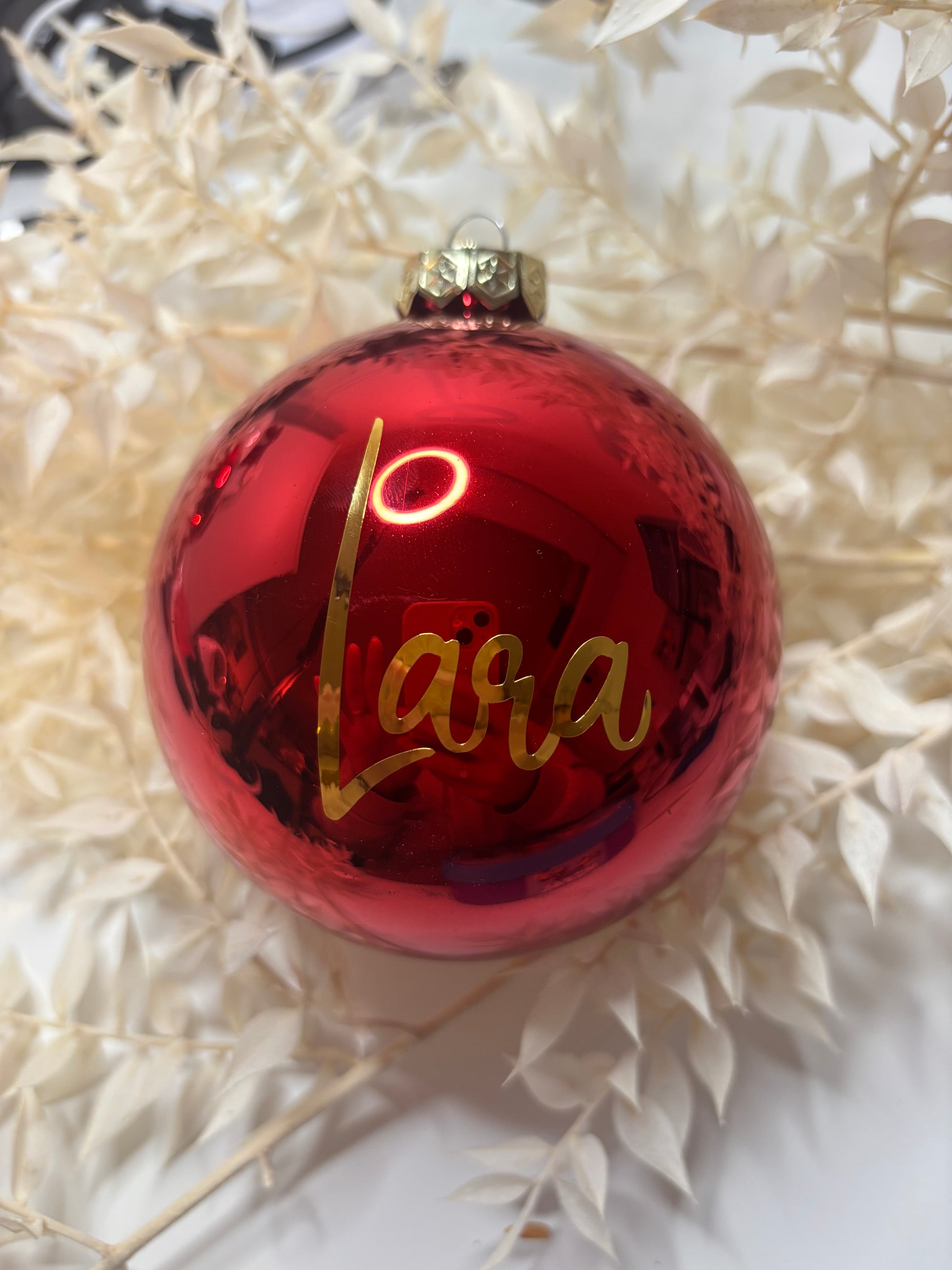 Damit deine Kugel etwas ganz Besonderes wird, kannst du sie mit deinem persönlichen Wunschtext gestalten – sei es ein Name, ein Datum oder ein kleiner Gruß. Der Schriftzug wird sorgfältig mit Vinylfolie geplottet, in deiner Lieblingsfarbe: von elegantem Gold über Silber bis hin zu Weiß, Schwarz oder vielen weiteren Tönen.